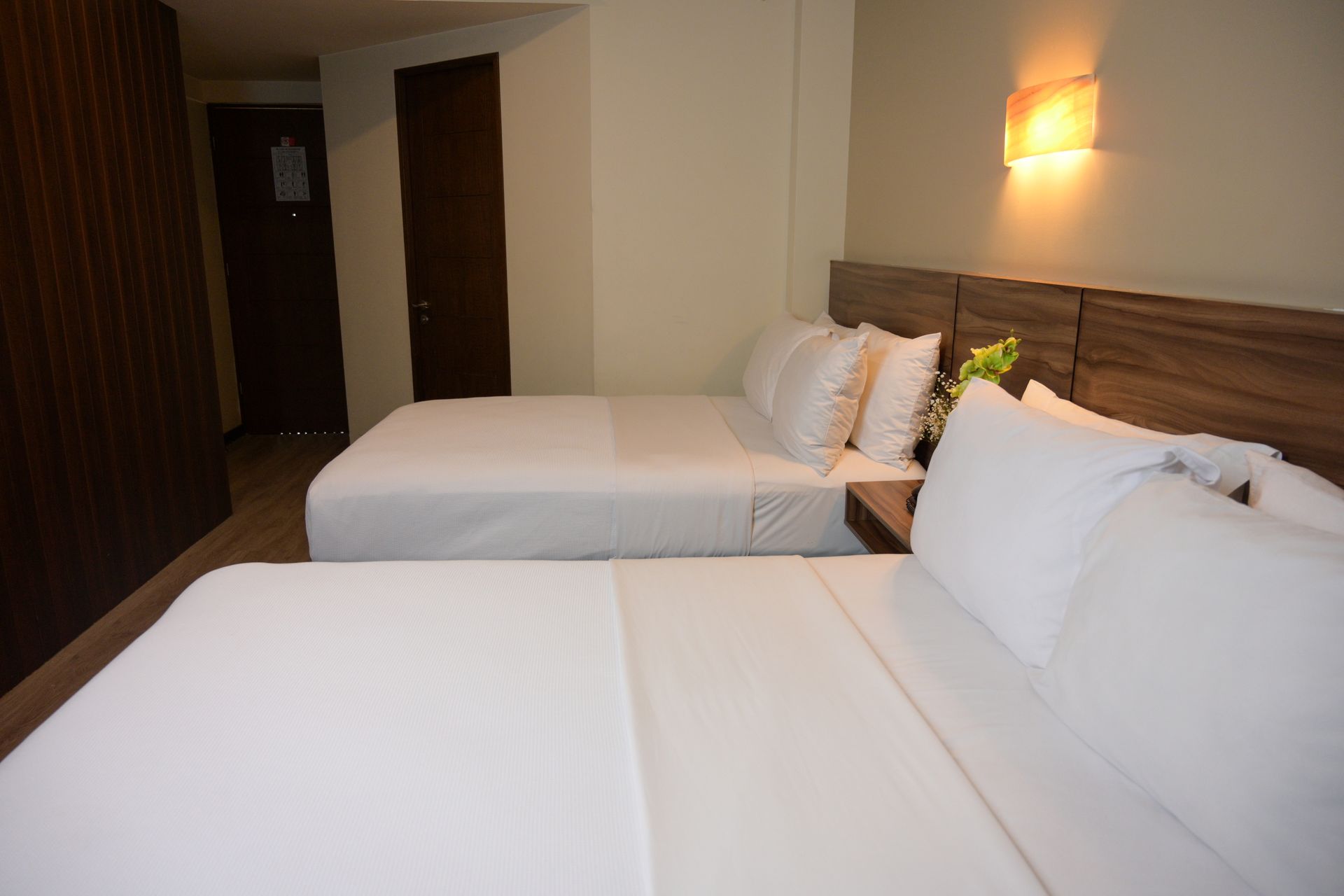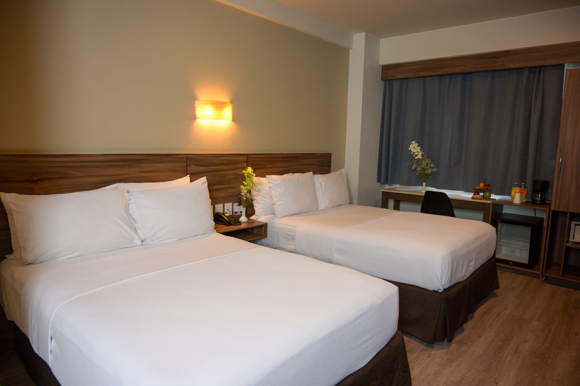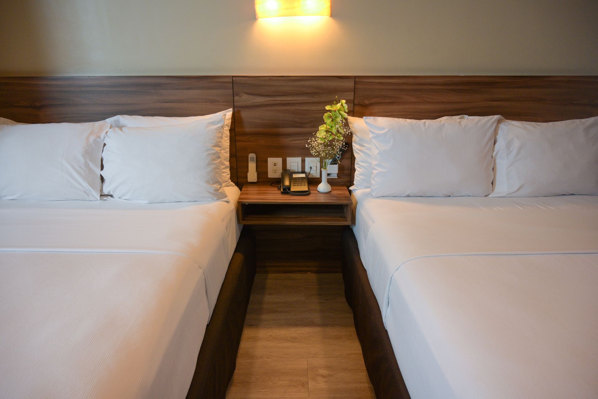 Habitación de 20 m2 con 2 camas matrimoniales y equipada con aire acondicionado, internet Wi-Fi, televisión por cable,telefono,television pantalla plana,secador de cabello y kit de cortesía, escritorio,armario,cafetera,minibar y caja fuerte.
