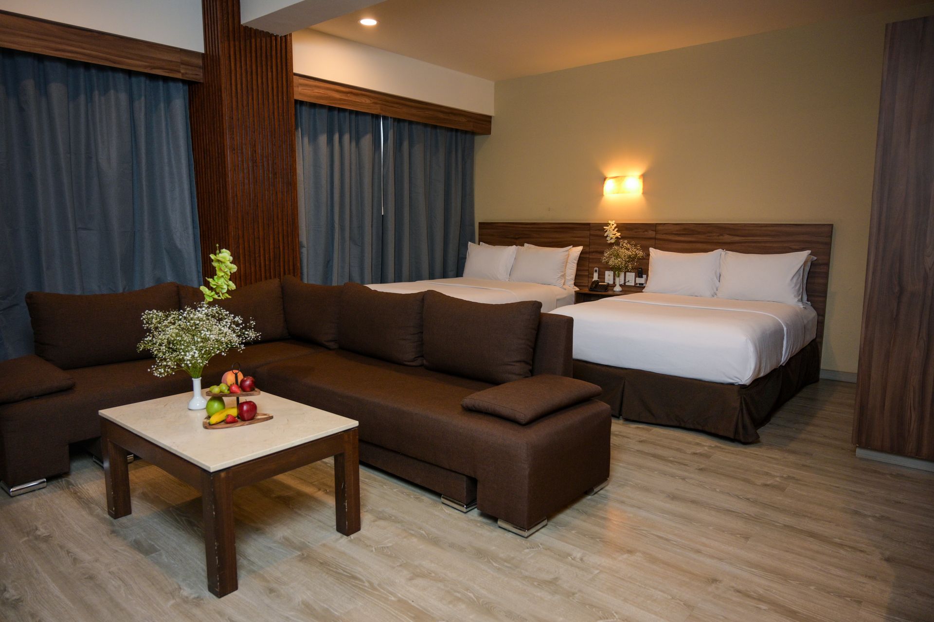 Habitación de 40 m2, con 2 camas matrimoniales y equipada con aire acondicionado, internet Wi-Fi, televisión por cable, teléfono, televisión pantalla plana, secador de cabello, kit de cortesía, escritorio, armario, cafetera, minibar, caja fuerte, sofá, zona de cocina y microondas, zona de comedor.