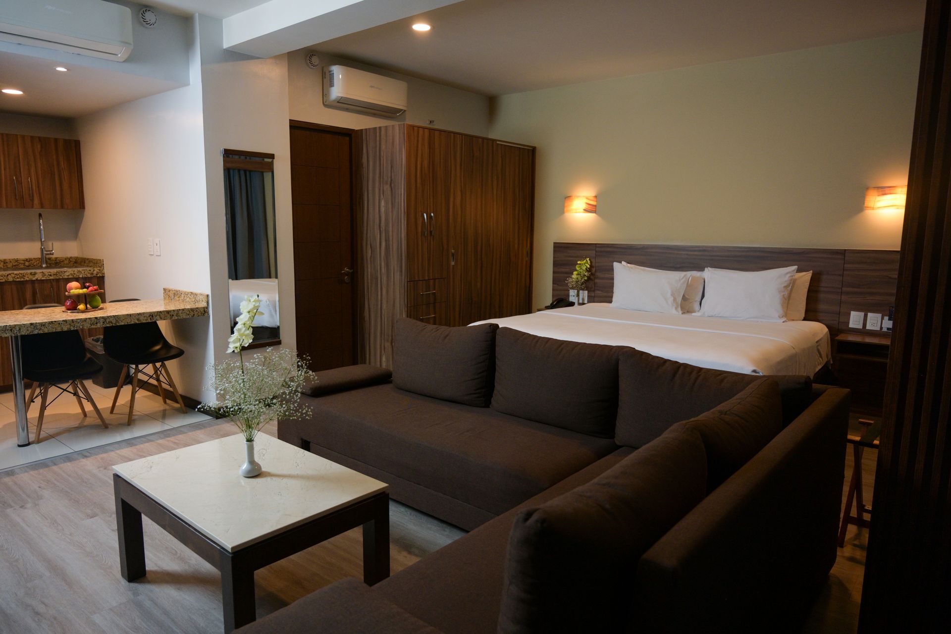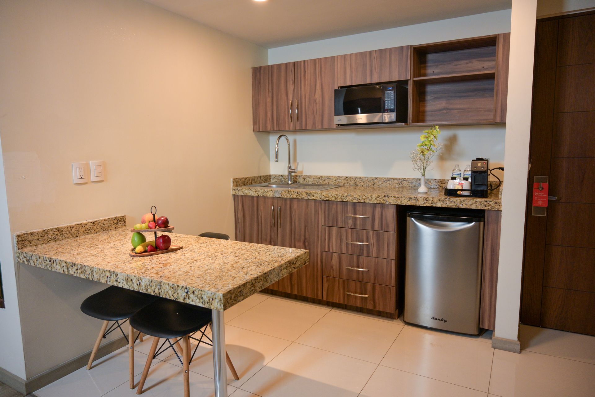 Habitación de 40 m2, con 1 cama king size y equipada con aire acondicionado, internet Wi-Fi, televisión por cable, teléfono, televisión pantalla plana, secador de cabello, kit de cortesía, escritorio, armario, cafetera, minibar, caja fuerte, sofá, zona de cocina y microondas, zona de comedor.